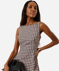 Vestido midi feminino confeccionado em tecido plano de algodão com padronagem xadrez. A peça tem modelagem acinturada, caimento rodado e solto ao corpo com pregas frontais. O modelo tem decote redondo, alças largas e fechamento por zíper invisível. Possui forro e acabamento pespontado na barra.