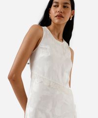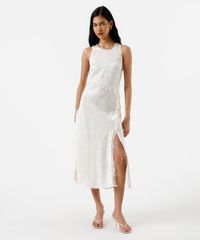 Vestido midi feminino confeccionado em jacquard floral com toque acetinado e detalhes em renda. A peça tem modelagem evasê, caimento rodado e solto ao corpo com fenda lateral. O modelo tem decote redondo, abertura posterior por botão e alças largas. Detalhe de acabamento pespontado na barra.