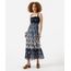 Vestido feminino confeciconado em tule com estampa de motivos florais. Possui modelagem evasê, caimento solto e fluido, alças finas com fivela para ajuste de tamanho, decote reto com acabamento ondulado, lastex aplicado no contorno superior com acabamento franzido, recortes em marias e forro embutido.
