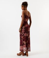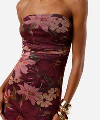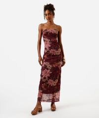 Vestido midi feminino confeccionado em tule de malha com estampa floral. A peça tem modelagem acinturada e caimento ajustado ao corpo. O modelo tem decote reto, sem alças e com franzidos laterais que modelam a silhueta. Possui forro em malha e acabamento pespontado na barra.