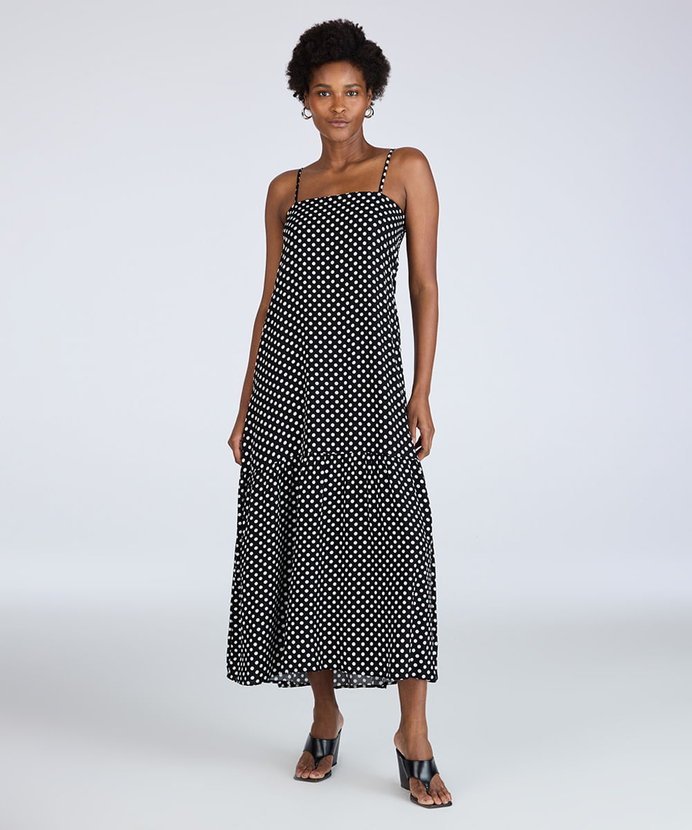 Vestido feminino confeccionado em malha de viscose com toque macio. A peça possui modelagem reta com marias e caimento solto, comprimento midi, decote quadrado, alça fina com ajuste, detalhe de recorte, padronagem em poá e acabamento pespontado.