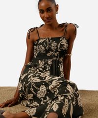 Para um look descontraído e fresco, combine este vestido midi com sandálias rasteirinhas ou papetes e uma bolsa de palha. Se a ocasião pedir um pouco mais de sofisticação, opte por sandálias de salto bloco e acessórios delicados. Nos dias mais amenos, uma jaqueta jeans ou um cardigã leve complementam a produção com muito charme.