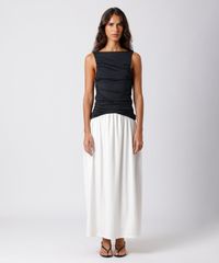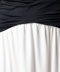 • Modelagem midi acinturada com saia de caimento fluido e solto ao corpo.