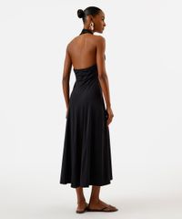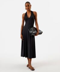Vestido midi feminino confeccionado em malha. A peça tem modelagem evasê, com recortes verticais que modelam a silhueta e caimento reto e solto ao corpo. O modelo tem decote v, frente única e fechamento posterior por botões encapados com aselhas. Possui forro em malha e acabamento pespontado na barra.