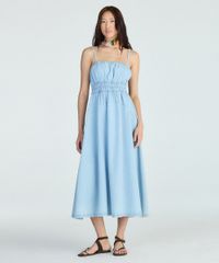 Vestido feminino confeccionado em jeans com toque macio. A peça possui modelagem godê com caimento solto, comprimento midi, decote quadrado, alça fina com ajuste, detalhe na cintura com elásticos embutidos causando um efeito franzido e recortes ambos auxiliando no desenho da silhueta, acabamento pespontado.