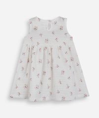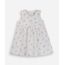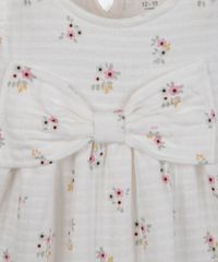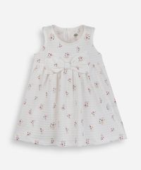 Vestido infantil confeccionado em malha de algodão texturizado e toque leve. A peça possui modelagem godê com caimento levemente solto, comprimento midi, decote redondo com botão e recorte posterior facilitando na hora de vestir a bebê, alças médias, detalhe frontal com aplicação de laço, estampa com desenho de florzinhas em cores contrastantes e acabamento pespontado.