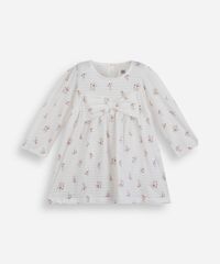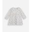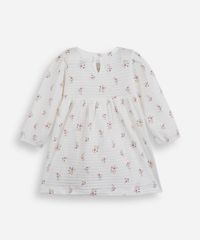 Vestido infantil confeccionado em malha de algodão texturizado e toque leve. A peça possui modelagem godê com caimento levemente solto, comprimento midi, decote redondo com botão e recorte posterior facilitando na hora de vestir a bebê, mangas longas estilo bufante, detalhe frontal com aplicação de laço, estampa com desenho de florzinhas em cores contrastantes e acabamento pespontado.