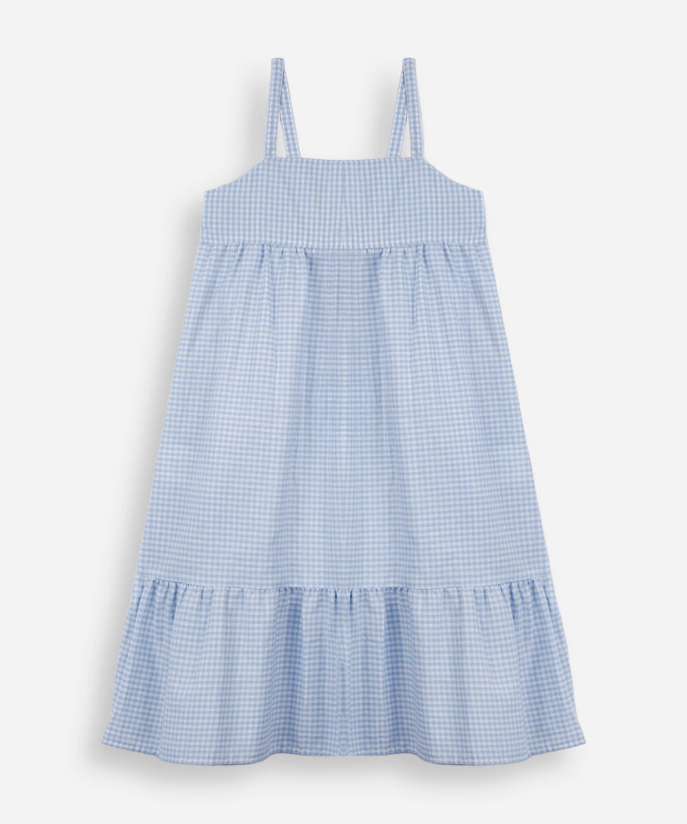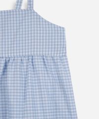 Vestido infantil confeccionado em tecido com malha de algodão e toque leve. A peça possui modelagem marias com caimento levemente solto, comprimento midi, decote quadrado, alças finas, detalhe de recortes, elástico embutido posterior, padronagem xadrez e acabamento pespontado.
