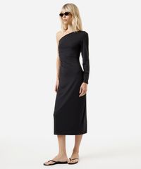 Vestido midi ombro único feminino confeccionado em malha. A peça corte acinturado com caimento reto e levemente ajustado ao corpo. O modelo tem decote diagonal e manga longa. Possui forro em malha e acabamento pespontado no punho e na barra.