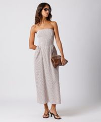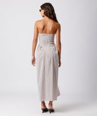 Vestido midi feminino confeccionado em tecido plano de algodão com estampa xadrez. A peça tem modelagem acinturada, caimento reto e solto com recortes que modelam a silhueta e franzidos laterais com leve volume. O modelo tem decote reto, sem alças e o fechamento é na parte posterior por zíper. Detalhe de acabamento pespontado na barra.