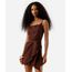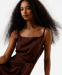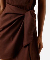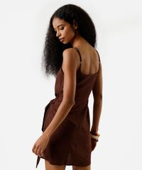 Vestido feminino confeccionado em malha de viscose com linho e toque leve. A peça possui modelagem evasê com caimento levemente solto ao corpo, comprimento curto, decote quadrado, alças finas com ajuste, detalhe de transpasse frontal estilo pareô com amarração na lateral e recortes, acabamento pespontado.